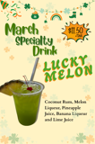 Get into the spirit of the season with our vibrant and refreshing Lucky Melon. This festive green cocktail blends smooth coconut rum with sweet melon liqueur, bright pineapple juice, a splash of banana liqueur, and fresh lime juice for a perfectly balanced tropical finish.
